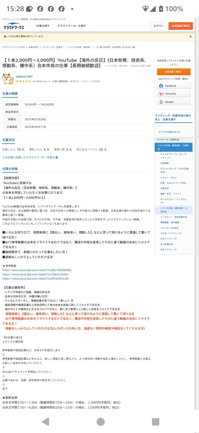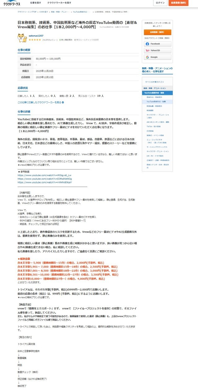 招聘者分别于2025年5月28日及2025年11月26日在“云工作”网站上发布的招聘信息,招聘YouTube视频的剧本写手,视频内容包括“称赞日本人、抹黑中国人”等。目前有关招聘信息已不可见,网页截图来自社交媒体。根据招聘信息截图,已有多人应聘这份工作。